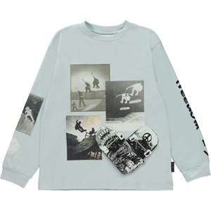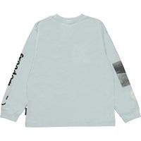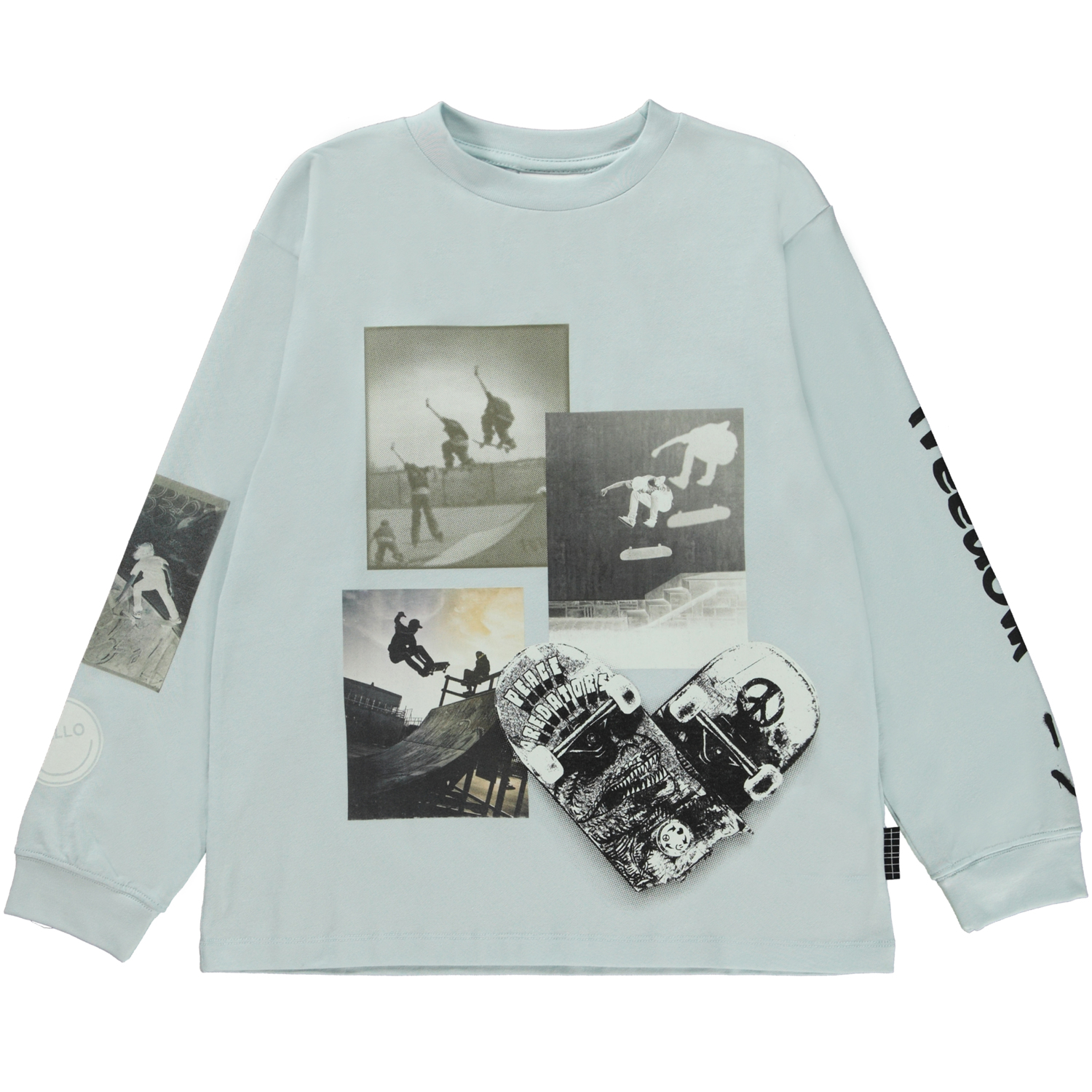 Rube is een lichtblauw t-shirt met lange mouwen en een print van verschillende skater motieven. Het t-shirt heeft ribboord rond de hals en mouwen.