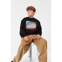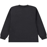 Zwarte biologisch katoenen longsleeve met een ronde hals en geribbelde boord rond de hals en manchetten. De longsleeve heeft een ruime pasvorm en een print aan de voorkant. De print toont een vage UFO, zoals te zien op het scherm in de cockpit van een gevechtspiloot.