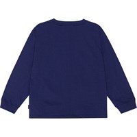 Donkerblauw shirt met lange mouwen van biologisch katoenen jersey. Het heeft een ronde hals en een normale tot ruime pasvorm. Op de voorkant staat een print van een donkere nacht met vliegende UFO's die de bomen van het bos verlichten.