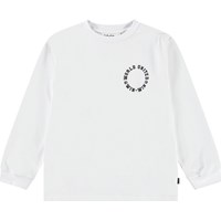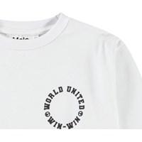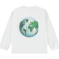 Witte longsleeve van biologisch katoen met ribboord rond de hals en mouwen. De longsleeve heeft een ruimvallende pasvorm en op de voorkant een print van een lichtblauwe voetbal waarop de wereld staat.