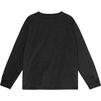Zwarte biologisch katoenen longsleeve met een ronde hals en geribbelde boord rond de hals en mouwen. Het heeft een ruime pasvorm en een print op de voorkant met de tekst "World Play" in rood, wit en zwart.