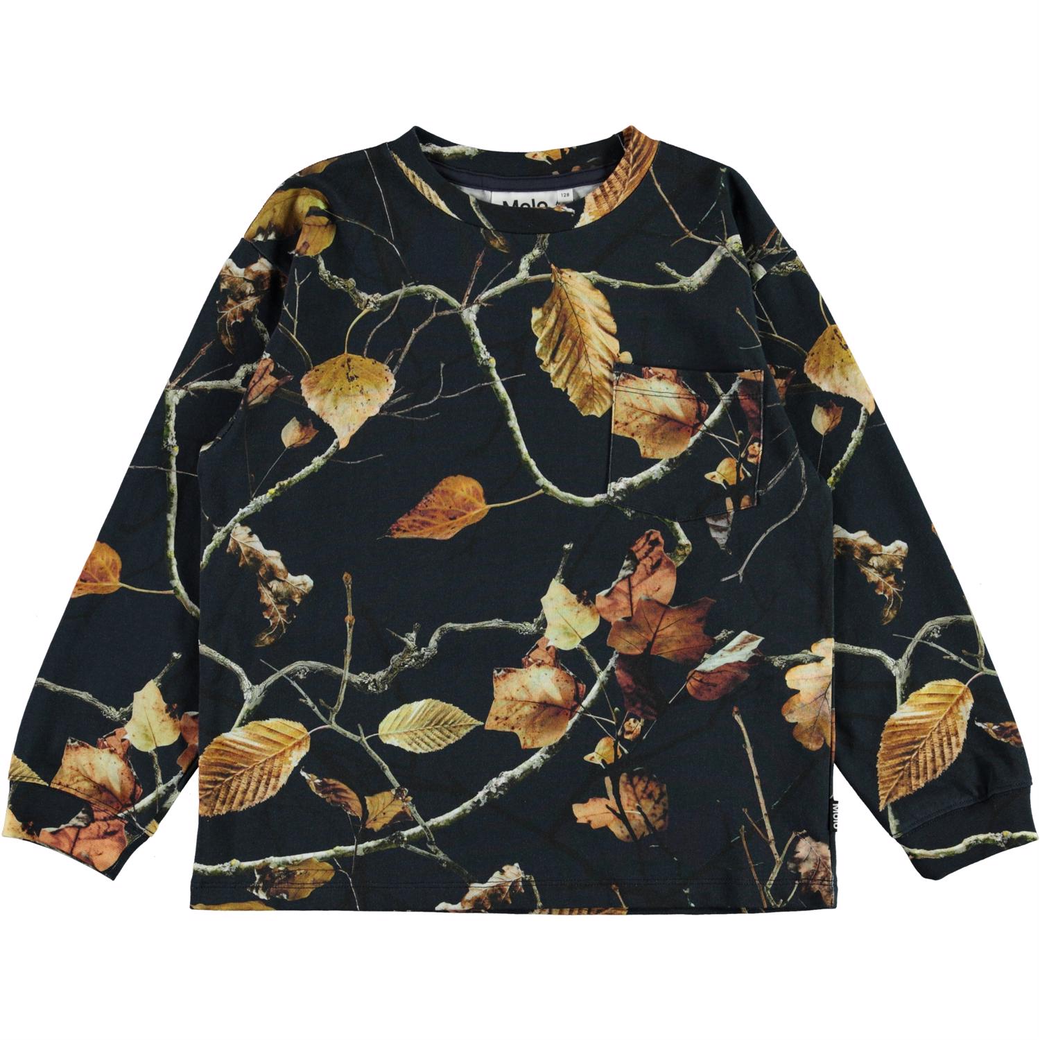 Ruben is een shirt met lange mouwen en een print van gouden bladeren. Het shirt heeft een zakje op de linkerborst.