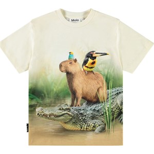 Beige biologisch katoenen t-shirt met korte mouwen en ribboord rond de hals. Het t-shirt heeft een ruimvallende pasvorm en een print van dieren uit de Amazone in prachtige kleuren wat doorloopt naar de achterkant.
