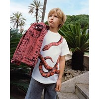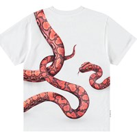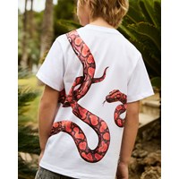 Wit biologisch katoenen t-shirt met korte mouwen en ribboord rond de hals. Het t-shirt heeft een ruimvallende pasvorm en een print van een rode slang die op de achterkant verder gaat.
