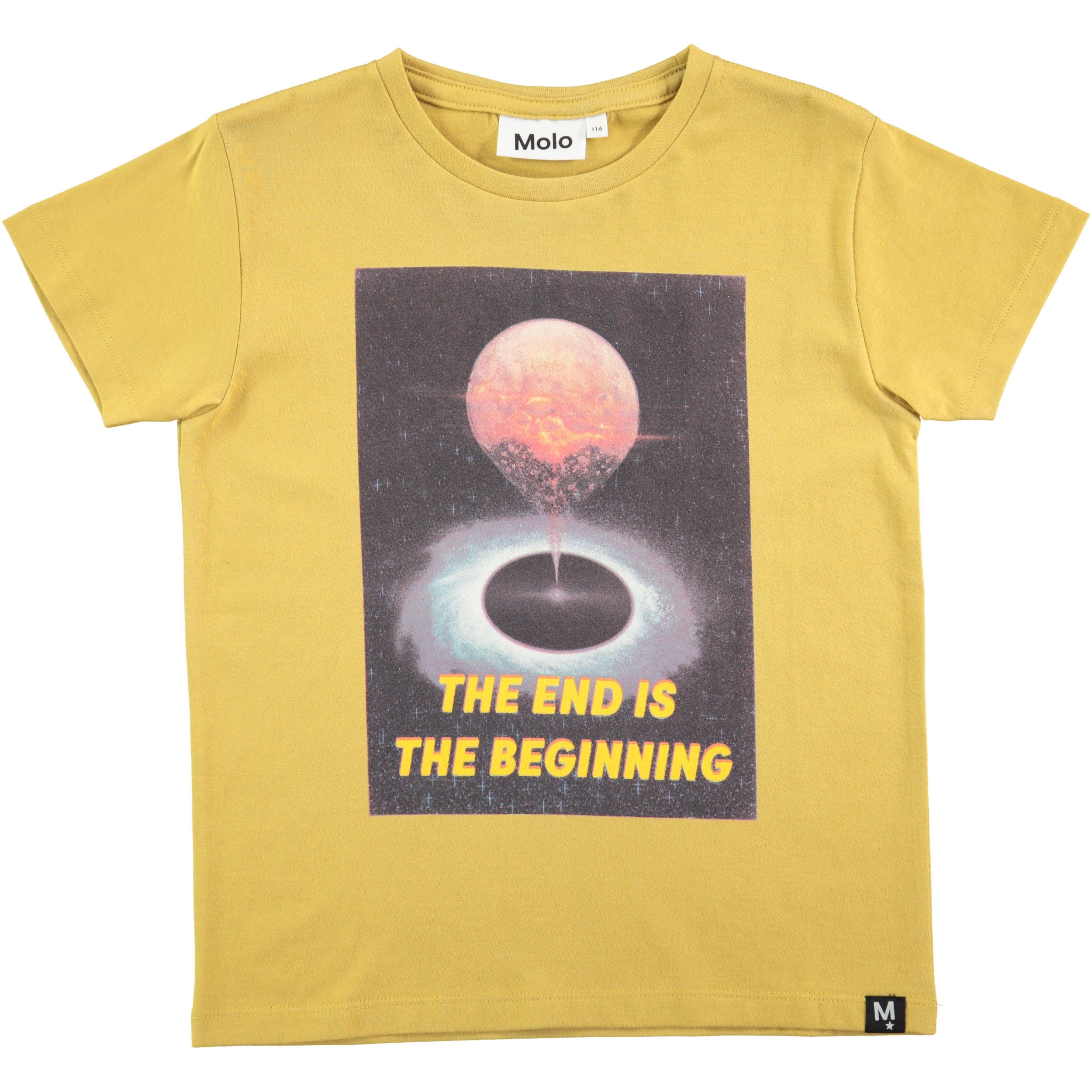 Kerriegeel shirt met korte mouwen met digitale ruimteprint op de voorkant.