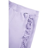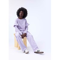 Paarse joggingbroek gemaakt van biologisch katoen met stretch. Deze joggingbroek heeft een ruimvallende pasvorm met een elastische taille, wijde pijpen en ruches aan de voorkant langs de pijpen. Combineer het met de bijpassende sweateri voor een complete look.