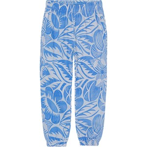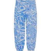 Lichtblauwe broek van biologisch katoen met een print van abstracte bloemen. De broek heeft een elastische taille met een koordje aan de binnenkant, waardoor het een goede vorm krijgt en de broek gemakkelijk aan te trekken is. Het heeft steekzakken en elastiek bij de pijpen voor een beetje volume.