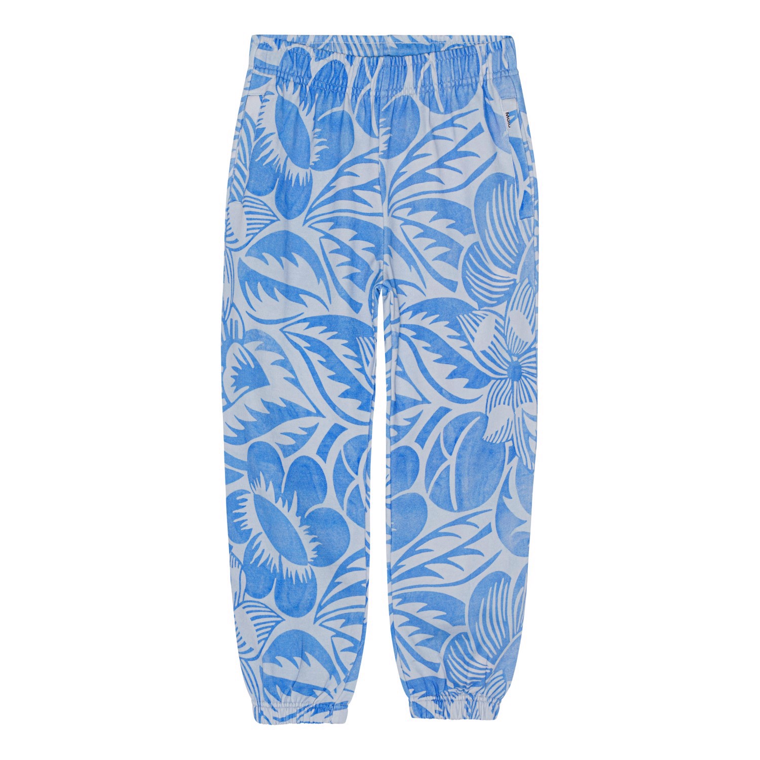 Lichtblauwe broek van biologisch katoen met een print van abstracte bloemen. De broek heeft een elastische taille met een koordje aan de binnenkant, waardoor het een goede vorm krijgt en de broek gemakkelijk aan te trekken is. Het heeft steekzakken en elastiek bij de pijpen voor een beetje volume.