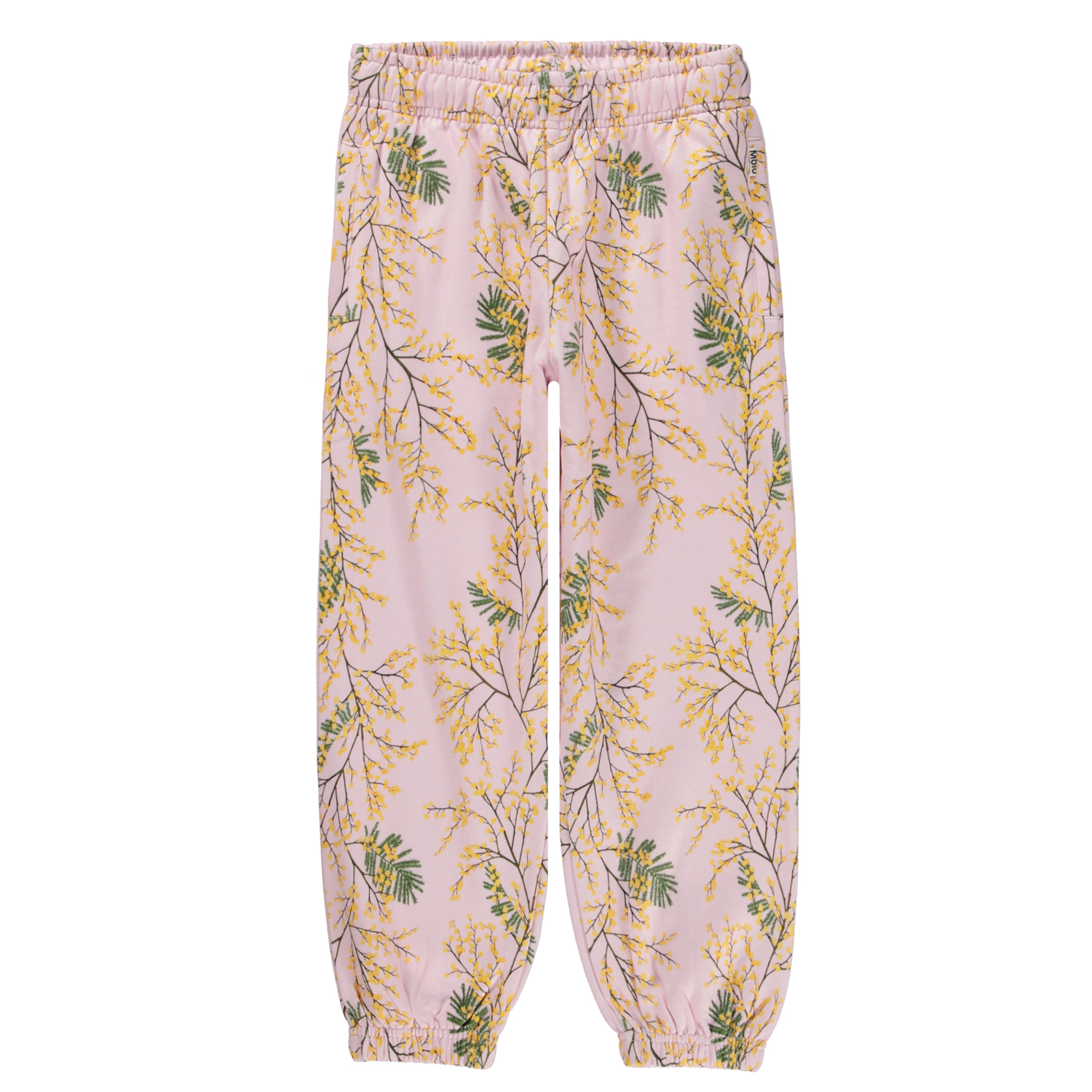 Lichtpaarse joggingbroek met een print van mooie, gele mimosa takken. Deze joggingbroek is van 100% katoen, heeft elastiek en koordjes aan de binnenkant van de taille, een achterzak, elastiek bij de enkels en heeft een normale pasvorm. Voor een super coole set draag je deze joggingbroek met de bijpassende sweater Marge die dezelfde print heeft.