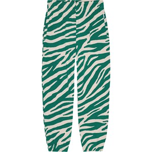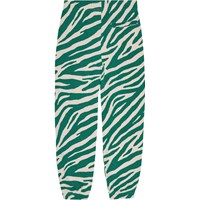 Groene en gebroken witte zebra-gestreepte joggingbroek van biologisch katoen met een gevoerde binnenkant, waardoor het zacht en warm is om te dragen. De broek heeft een elastische taille met een koordje, elastiek bij de pijpen en zijzakken. Het heeft een normale pasvorm en kan worden gecombineerd met een bijpassende sweater voor een complete set.