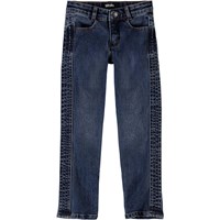 Adele is een blauwe jeans met stiksels aan de zijkanten van de pijpen. De jeans heeft een normale pasvorm. Let op: maten t/m 134 hebben drukknopen en geen jeansknopen.
