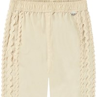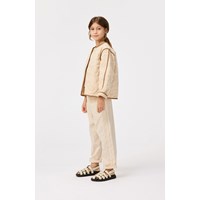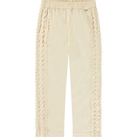 Broek van biologisch katoen. De broek heeft een elastische taille, lange pijpen en mooie linten die langs de zijkanten van de pijpen lopen.