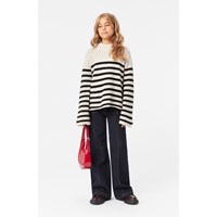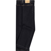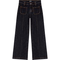 Donkerblauwe jaren '70 spijkerbroek van biologisch katoen met gestikte vouw. De broek heeft een drukknoop- en ritssluiting, evenals riemlussen. Er zit ook een verstelbare knoop aan de binnenkant van de taille voor een goede pasvorm. De broek heeft uitlopende pijpen en er zitten opgestikte zakken aan de voorkant.