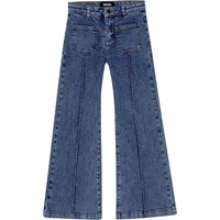 Denimblauwe jaren 70 jeans van biologisch katoen met gestikte vouw. De broek heeft een drukknoop- en ritssluiting, riemlussen en een verstelbare knoop aan de binnenkant van de taille voor een goede pasvorm. Het heeft uitlopende pijpen en opgestikte zakken aan de voorkant.