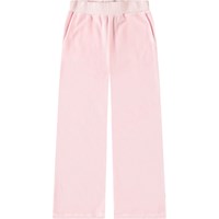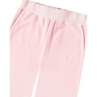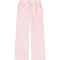 Roze fluwelen broek van zacht katoen met een uitlopende trompetvorm. De broek heeft een brede elastische tailleband met een intern koordje, waardoor het gemakkelijk aan te trekken is en comfortabel draagt. Combineer de broek met een bijpassende hoodie voor een zachte en sportieve outfit.