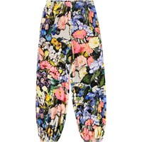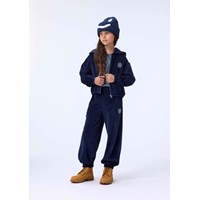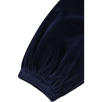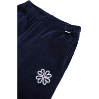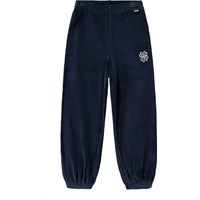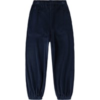 Donkerblauwe fluwelen broek van zacht katoen in een normale pasvorm met een elastische tailleband en boorden. De broek heeft witte borduursels op de zak.