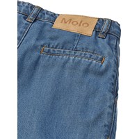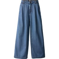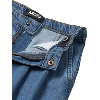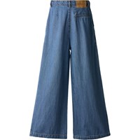 Wijde lichtblauwe spijkerbroek met voorzakken, achterzak en een grote plooi aan de voorkant voor een boxy look. Het heeft een verstelbare taille met riemlussen en een knoop- en ritssluiting. De kleinste maten (92–134) hebben een drukknoop en de maten 140–176 hebben een klassieke jeansknoop.