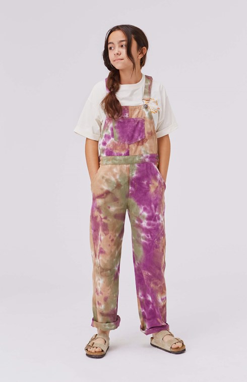 Aer is een tuinbroek in een kleurrijke tie-dye print. Het heeft zakken aan de voorkant en verstelbare schouderbandjes.