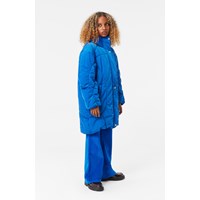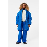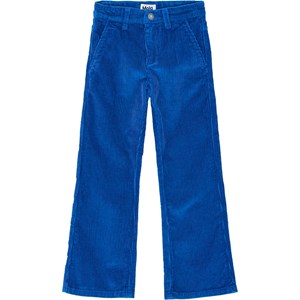 Donkerblauwe broek van zacht katoenen fluweel met uitlopende pijpen. De broek heeft zowel voor- als achterzakken, en sluit met een knoop en rits in de taille en heeft een verstelbare elastiek band aan de binnenkant voor een comfortabele pasvorm.