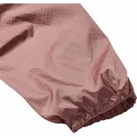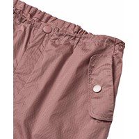 Donkerroze broek van nylon. Deze broek heeft een elastische koordje in de taille en elastiek rond de enkels, wat het een ??stoere en sportieve look geeft. Het heeft ook zijzakken met knoopsluiting en een enkele achterzak.