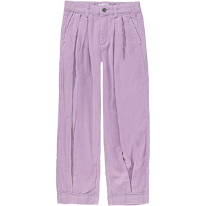 Paarse broek van corduroy. Deze broek is van 100% katoen, heeft plooien aan de bovenzijde en bij de enkels om een wijde pijp te creëren. Het heeft steekzakken, achterzakken en een ruimvallende pasvorm. De tailleband van de broek kan worden aangepast met een elastiek aan de binnenkant, zodat het perfect past bij alle kinderen. Maten 92-134 hebben een drukknoop voor het gemakkelijk aan- en uittrekken. Maten 140-176 hebben een gewone jeansknoop.