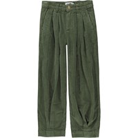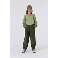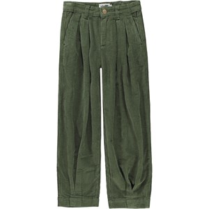 Groene broek van corduroy. Deze broek is van 100% katoen, heeft plooien aan de bovenzijde en bij de enkels om een wijde pijp te creëren. Het heeft steekzakken, achterzakken en een ruimvallende pasvorm. De tailleband van de broek kan worden aangepast met een elastiek aan de binnenkant, zodat het perfect past bij alle kinderen. Maten 92-134 hebben een drukknoop voor het gemakkelijk aan- en uittrekken. Maten 140-176 hebben een gewone jeansknoop.