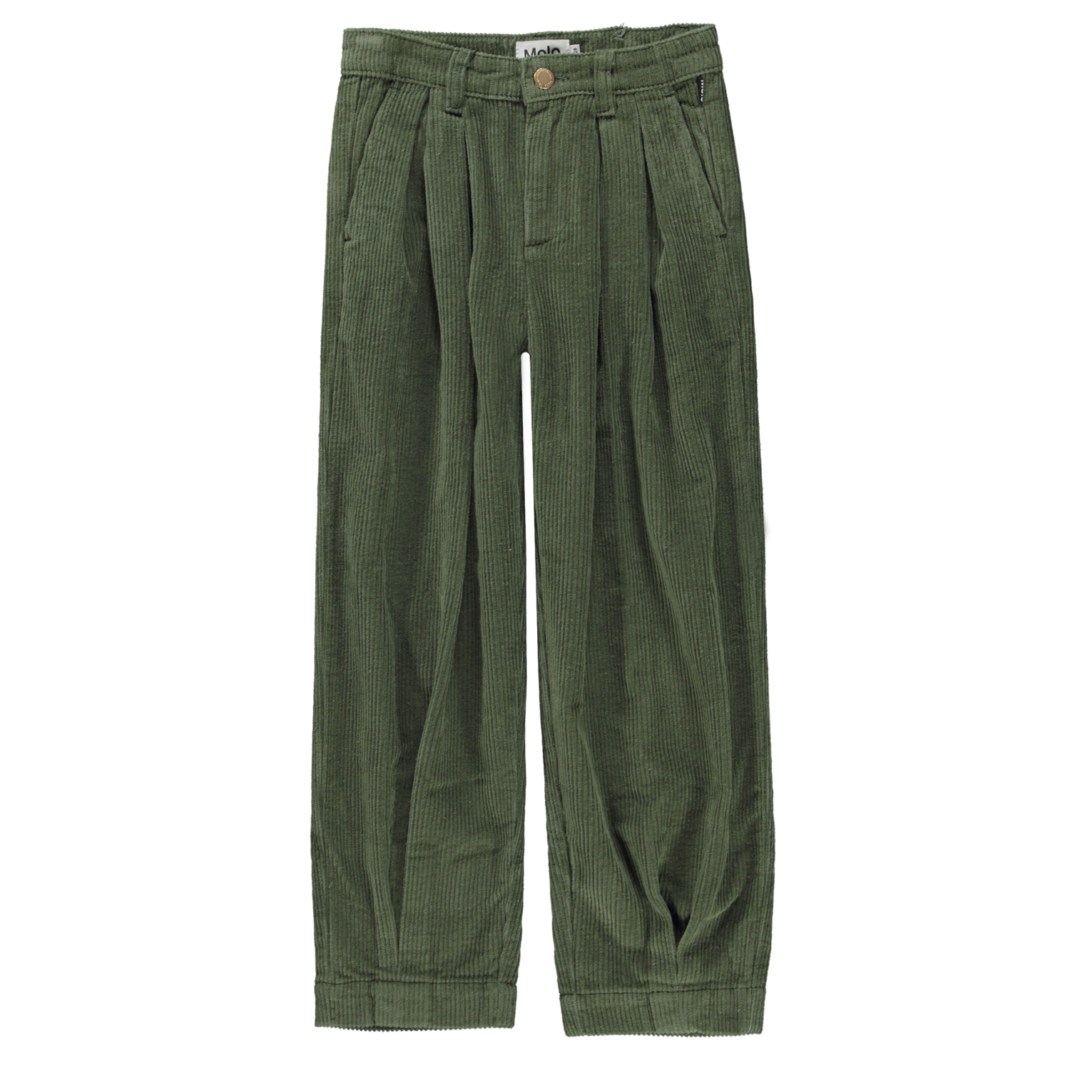 Groene broek van corduroy. Deze broek is van 100% katoen, heeft plooien aan de bovenzijde en bij de enkels om een wijde pijp te creëren. Het heeft steekzakken, achterzakken en een ruimvallende pasvorm. De tailleband van de broek kan worden aangepast met een elastiek aan de binnenkant, zodat het perfect past bij alle kinderen. Maten 92-134 hebben een drukknoop voor het gemakkelijk aan- en uittrekken. Maten 140-176 hebben een gewone jeansknoop.
