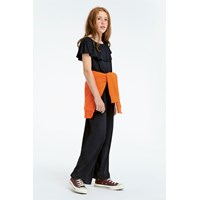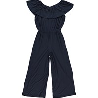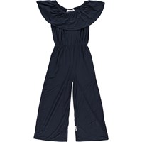 Alena is een donkerblauwe jumpsuit in jersey. Het is mouwloos en heeft brede pijpen en een elastische taille.