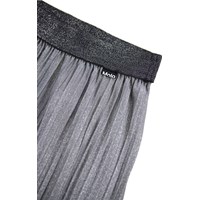 Grijze geplooide broek met zilveren glans. De broek heeft een ruimvallende pasvorm met wijde pijpen en een elastische taille, ook met zilveren glans.