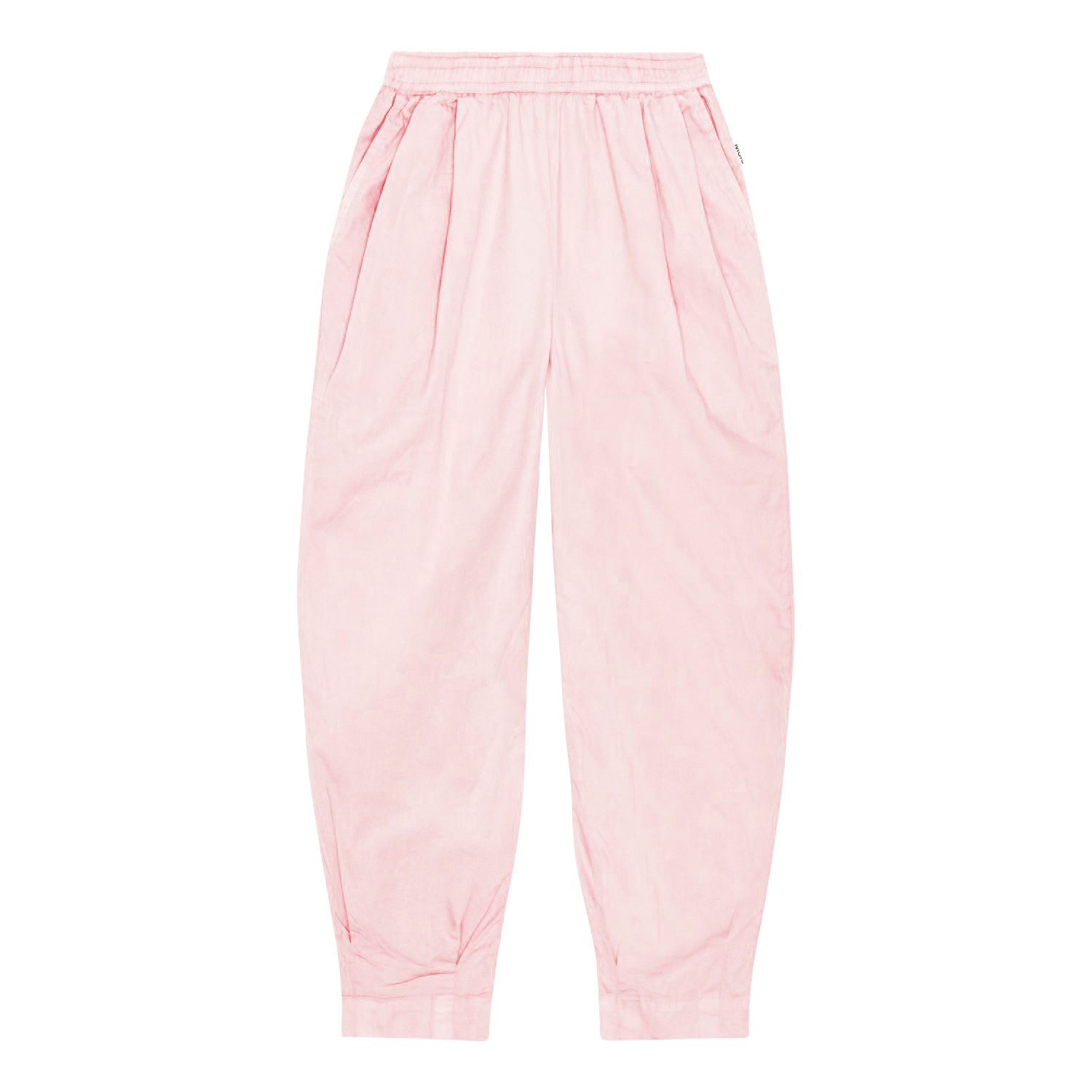 Roze katoenen broek. Door de elastische taille is de broek uiterst comfortabel en gemakkelijk aan te trekken. Het heeft een plooi aan de voorkant om het extra volume te geven. De broek heeft steekzakken in de zijnaad en plooien aan de onderkant van de broekspijp die zorgen voor een wijd effect.