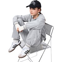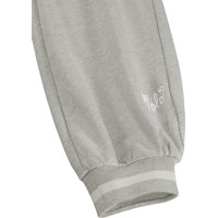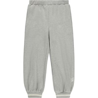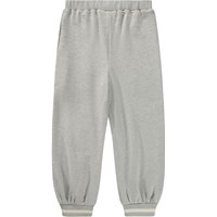 Lichtgrijze joggingbroek gemaakt van zacht biologisch katoen in een relaxte pasvorm. De broek heeft een elastische tailleband en koordje, zijzakken en ribboorden met strepen rond de enkels voor een sportieve afwerking.