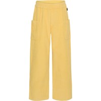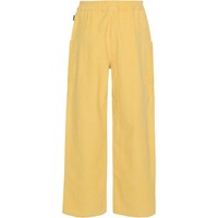 Gele broek van corduroy. Het is van 100% katoen, heeft wijde pijpen, elastiek in de taille, zakken op de pijpen en een normale pasvorm.