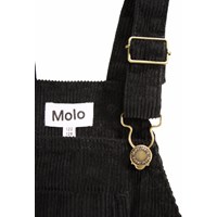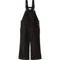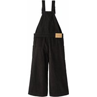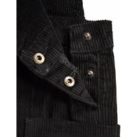 Zwarte zachte ribfluwelen tuinbroek. De tuinbroek heeft verstelbare schouderbretels, een klein voorvak op de borst, opgestikte zakken aan de zijkant van het dijbeen en twee drukknopen aan de zijkant waardoor het gemakkelijk aan te trekken is. De tuinbroek heeft een tailleband en wijde pijpen.