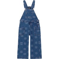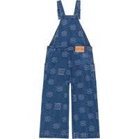 Donkerblauwe spijkertuinbroek met Molo's geborduurd klavertjes en het woord 'Love'. Het heeft verstelbare bretels, een klein zakje op de borst, steekzakken en opgestikte zakken op de pijpen. De tuinbroek heeft wijde pijpen en drukknopen aan de zijkanten, zodat je het gemakkelijk aan kunt trekken.