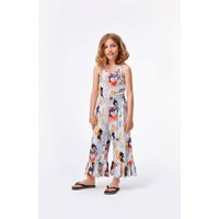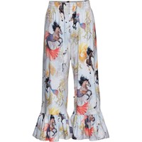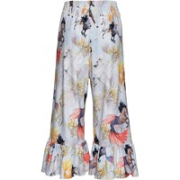 Anis is een lichtblauwe culotte broek met een print van paarden onder het wateroppervlak. Het heeft een elastische tailleband en een ruche rand rond de pijpen.