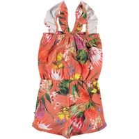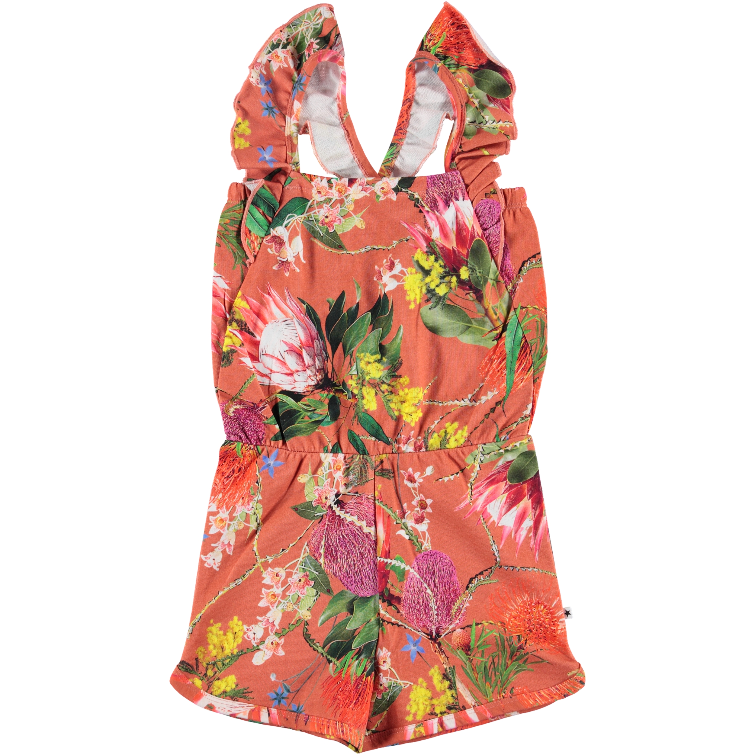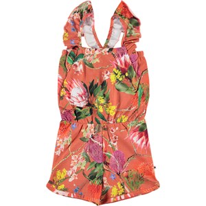 De mooie wilde bloemen van Australië zijn verzameld op de Anita jumpsuit die gemakkelijk aan en uit te trekken is. Het heeft korte pijpen en bandjes met ruches.
