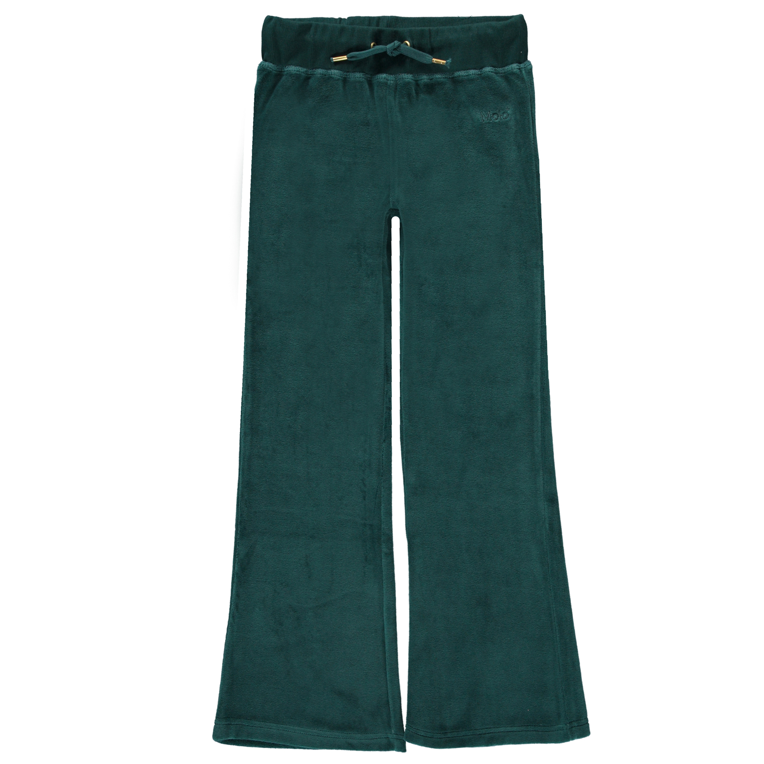 Annie een groene fluwelen joggingbroek. Het heeft licht uitlopende pijpen en een elastische taille met koordjes. Draag de joggingbroek met de bijpassende hoodie voor een complete look.
