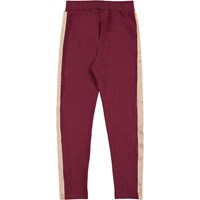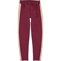 Antonia is een donkerrode trainingsbroek met een gouden streep langs de zijkanten van de benen. Het heeft een elastische taille voor een comfortabele pasvorm.