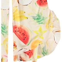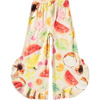 Luchtige broek met ruches gemaakt van biologisch katoen. De broek heeft een ruimvallende pasvorm, een zijrits en elastiek aan de achterkant, waardoor het comfortabel is om te dragen. Het heeft een all over print van exotisch fruit.