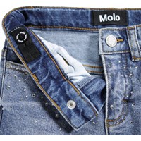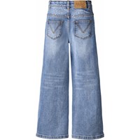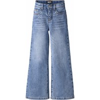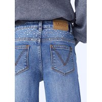 Blauwe spijkerbroek gemaakt van biologisch katoen met stretch, 5 zakken, wijde pijpen en een normale pasvorm. De spijkerbroek is versierd met strass-steentjes aan de voorkant en achterkant.