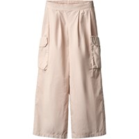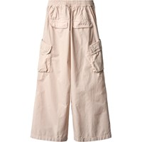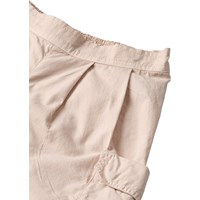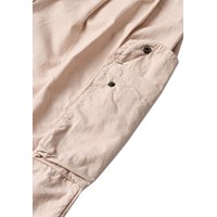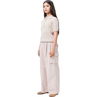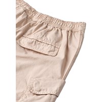 Beige broek gemaakt van biologisch katoen met een lichte textuur die een stijlvolle en relaxte uitstraling geeft. Het heeft ruime cargozakken op de bovenbenen en brede plooien aan de voorkant, wat extra breedte en een baggy look creëert. De taille is aan de voorkant vast en elastisch aan de achterkant, wat zorgt voor een comfortabele pasvorm en het is gemakkelijk aan en uit te trekken.