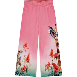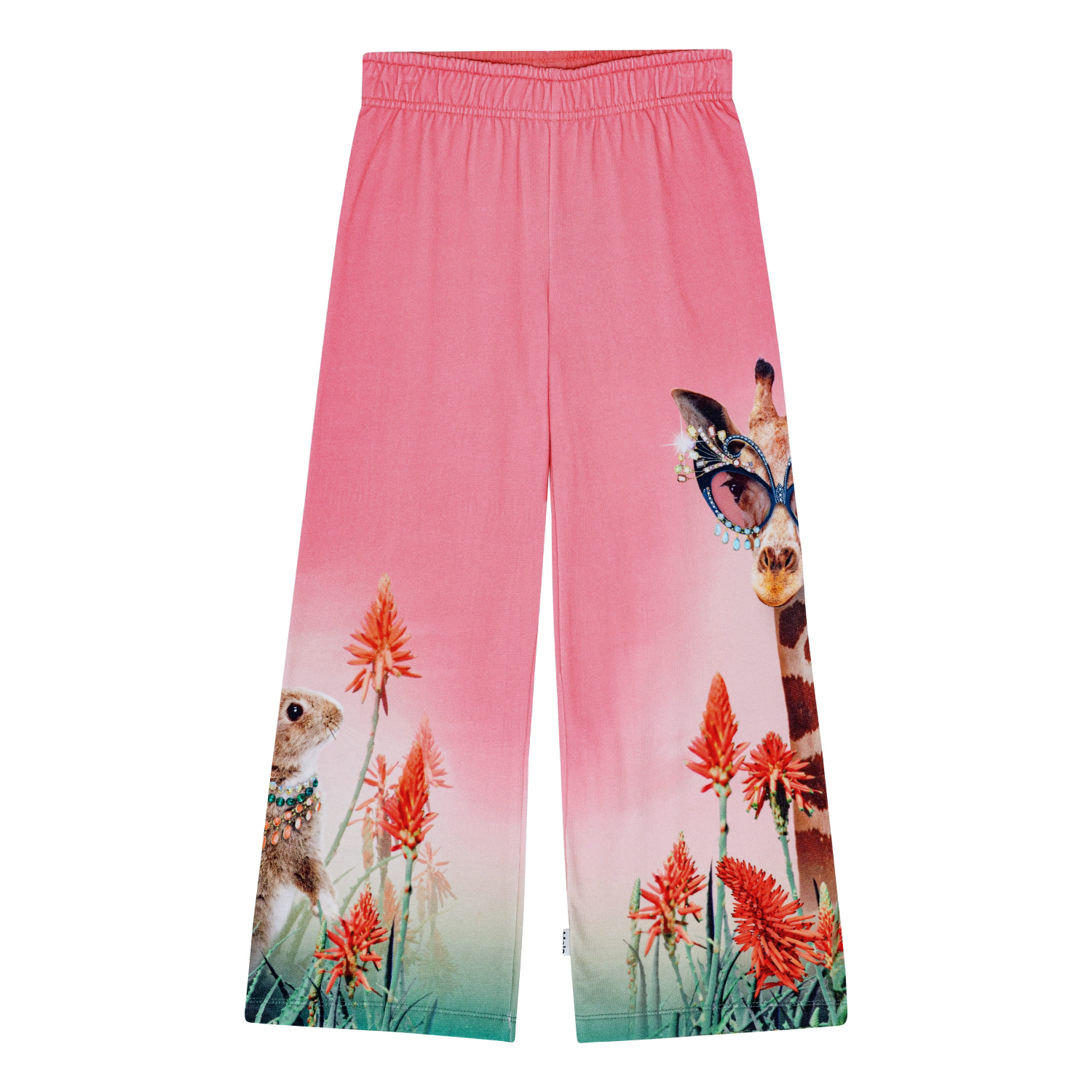 Roze joggingbroeken van biologisch katoen in een ruimvallende pasvorm met een elastische tailleband, die ervoor zorgt dat het gemakkelijk aan te trekken is en comfortabele zit. Het heeft een print van oranje bloemen, giraffen en konijnen in feestelijke outfits langs beide pijpen. Combineer het met een bijpassende sweater voor een complete en zachte set. Gevoerde binnenkant zorgt voor extra zachtheid en warmte.