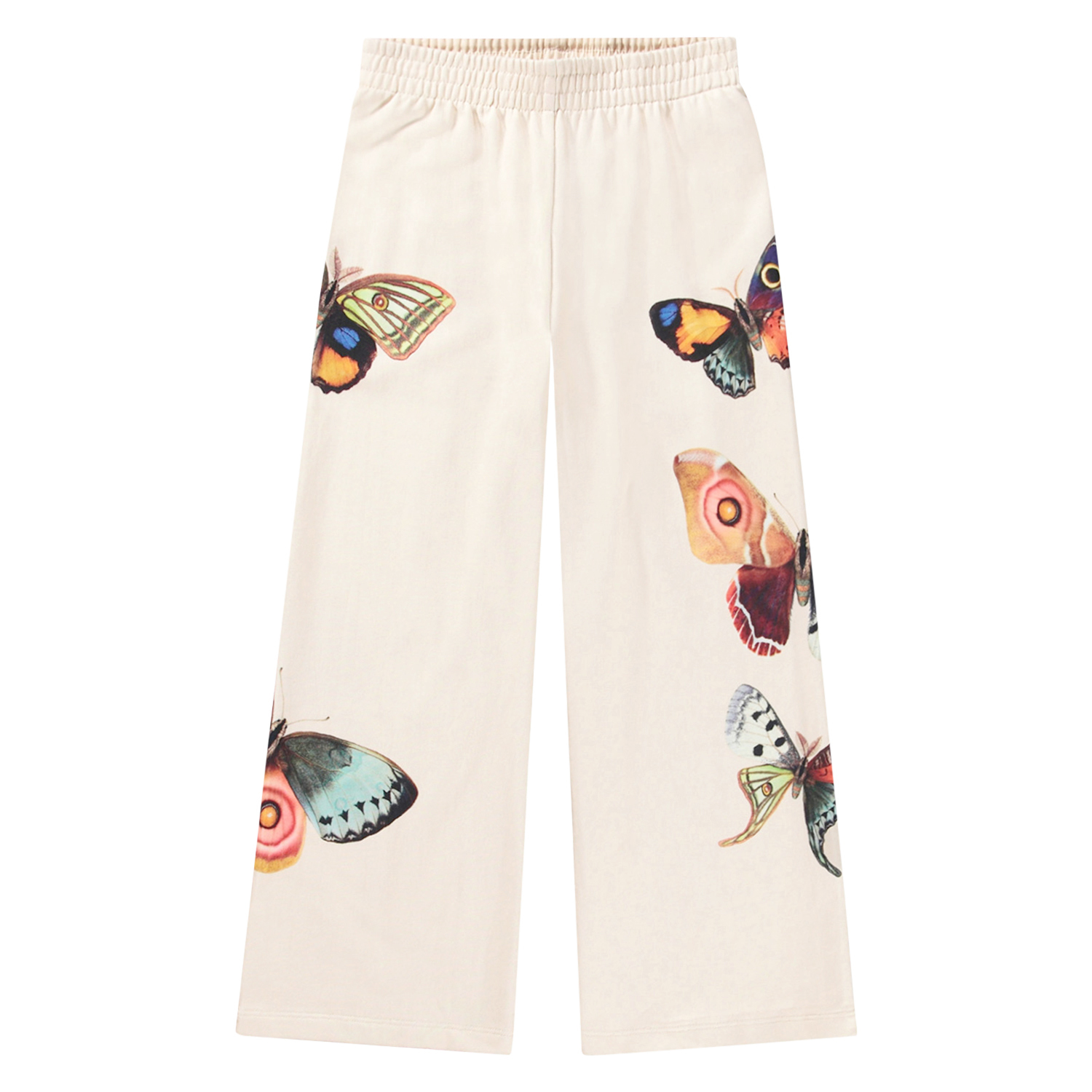 Gebrokken witte joggingbroeken van biologisch katoen in een ruimvallende pasvorm met een elastische tailleband, die ervoor zorgt dat het gemakkelijk aan te trekken is en comfortabele zit. Het heeft een kleurrijke print van prachtige vlinders langs beide pijpen. Combineer het met een bijpassende poncho voor een complete en zachte set. Gevoerde binnenkant zorgt voor extra zachtheid en warmte.