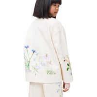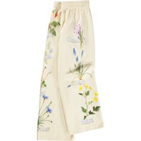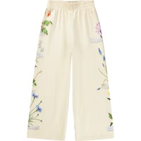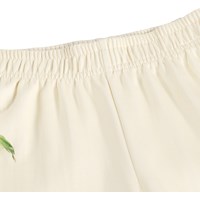 Gebroken witte jerseybroek van zacht biologisch katoen. De broek heeft een ruimvallende pasvorm en een elastische tailleband die het gemakkelijk makat om aan te trekken en zoght voor een hoog comfort. Het model is wijd en heeft een fijn natuurmotief langs de zijkant van de benen gedrukt.