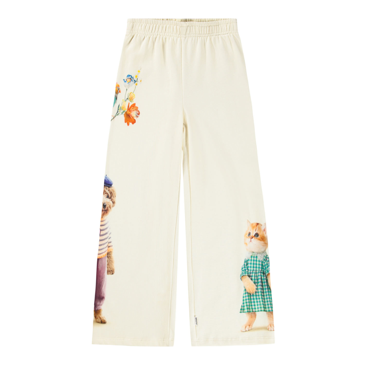 Gebroken witte joggingbroek gemaakt van biologisch katoen. Dej joggingbroek heeft een ruimvallende pasvorm met wijde pijpen en elastiek rond de taille en een kleurrijke print van schattige dieren die kleding dragen. Combineer de joggingbroek met de sweater om de set compleet te maken.