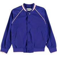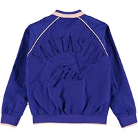 Sportief blauw college jas met een knisperende textuur. Het jack heeft knopen aan de voorkant, steekzakken, gestreepte ribboord bij de hals, mouwen en onderkant. Het heeft een mooi borduursel aan de achterkant.