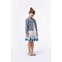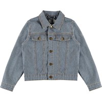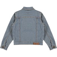 Heidi is een spijkerjas met smalle blauwe en witte strepen. De jas heeft een knoopsluiting en zakken aan de voorkant.