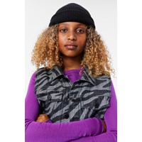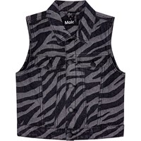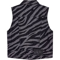 Grijs en zwart zebra-gestreept jeans bodywarmer van katoen. De bodywarmer heeft een aansluitende pasvorm en borstzakken. Het sluit met zwarte drukknopen. Je kunt de bodywarmer combineren met een bijpassende rok of broek om een complete en stijlvolle jeansoutfit te creëren.