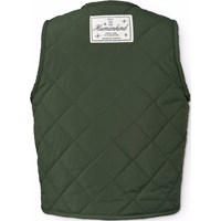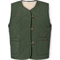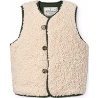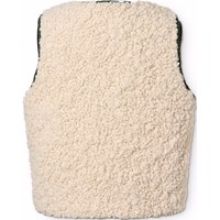Omkeerbaar gilet met knoopsluiting gemaakt van gerecycled polyester. De gilet is aan de ene kant doorgestikt in het groen en aan de andere kant in zachte crèmekleurige teddy fleece. Op de achterkant van de gilet zit een klein label met de tekst ''Humankind - Being Kind to Humankind''.