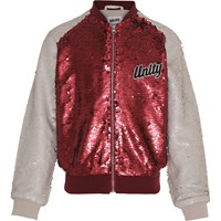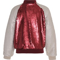 Hubertha is een rood, met pailletten bedekt bomberjas met witte mouwen. Het heeft een ritssluiting en ribboorden. Strijk de pailletten op voor nog meer glans en beweging op de jas.